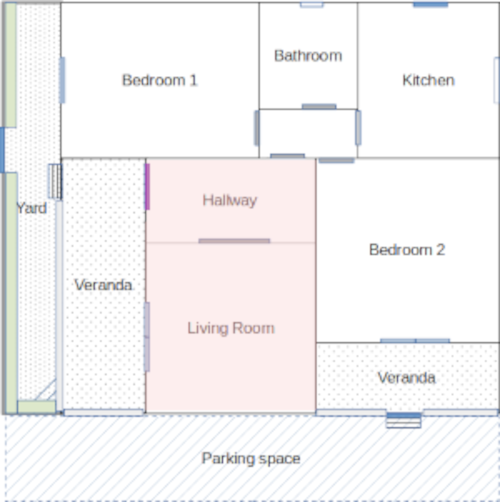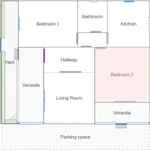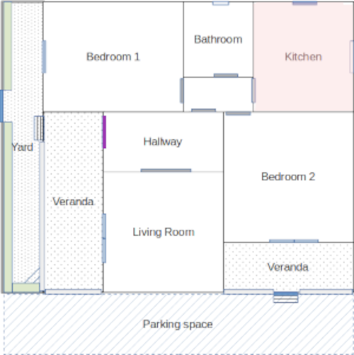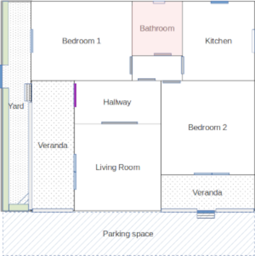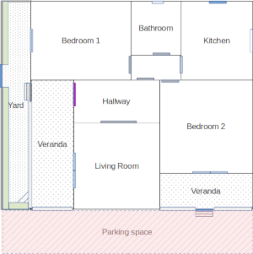 Υπάρχουν δύο βεράντες στο σπίτι. Η μία βρίσκεται στην πρόσοψη, έξω από το καθιστικό και βλέπει στον δρόμο. Η άλλη, μικρότερη βεράντα, βρίσκεται στο πλάι του σπιτιού έξω από το Υπνοδωμάτιο 2. Αυτή είναι πιο ήσυχη και με περισσότερη ιδιωτικότητα. Υπάρχει επίσης και μιά μακρόστενη αυλή στο μπροστινό μέρος του σπιτιού με όμορφα λουλούδια.