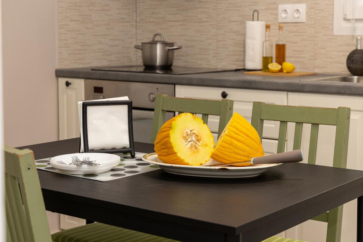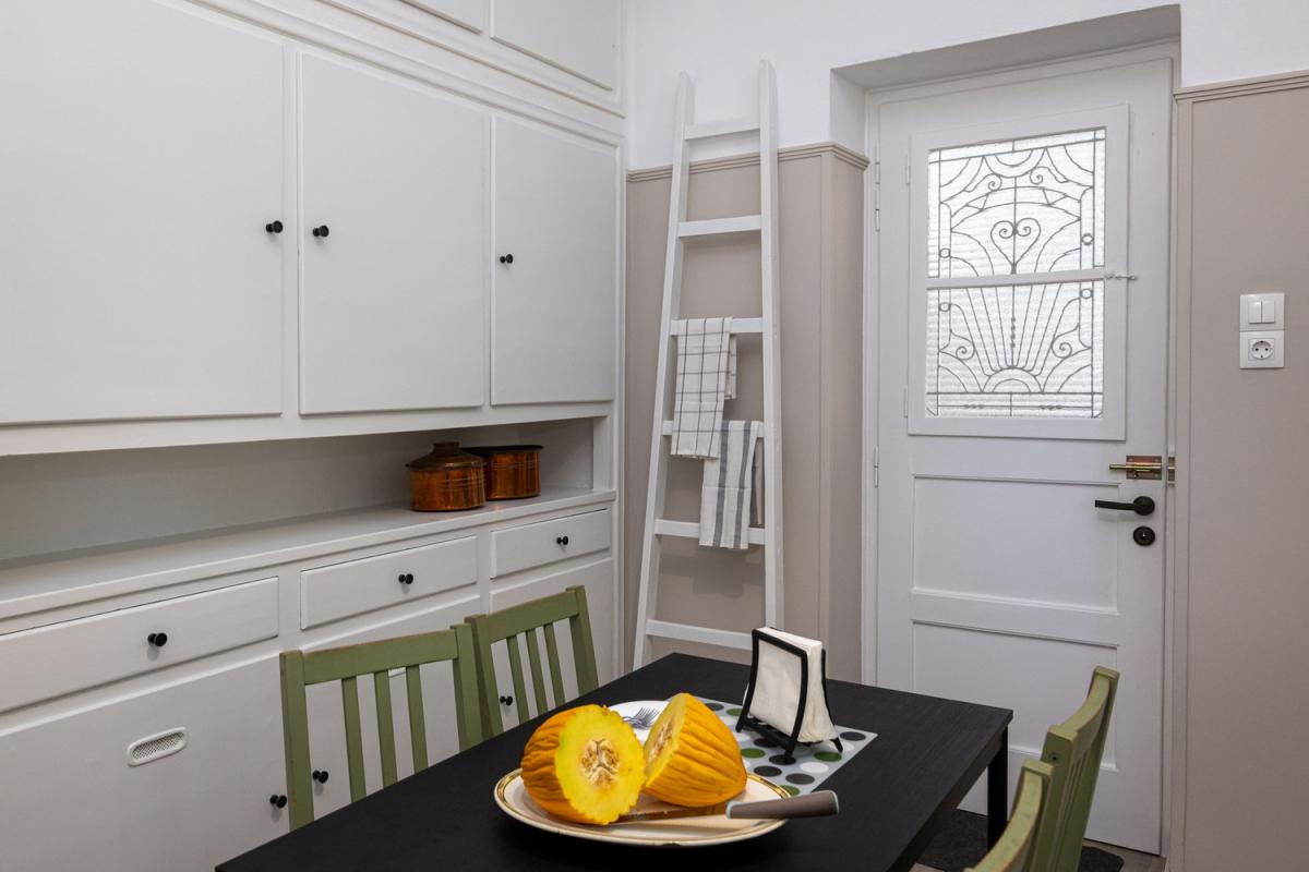 Μια πλήρως εξοπλισμένη κουζίνα με συσκευές μαγειρέματος και είδη φαγητού.